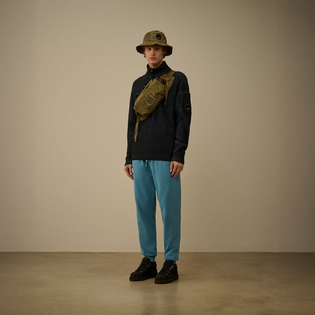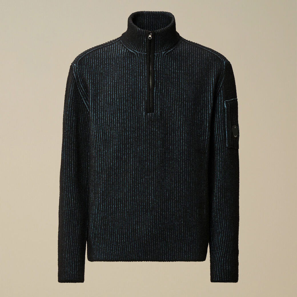 Half zip sweater crafted in vanisé lambswool with contrast Polyester chenille. The knit features a ribbed collar and C.P. Company’s iconic Lens. 7 Gauge knit. Regular fit.