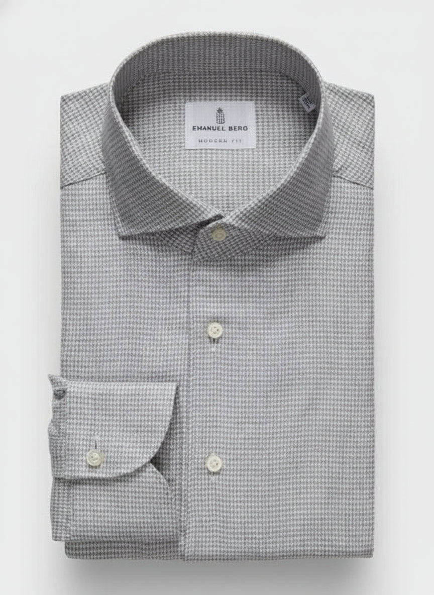 A refined balance of softness, structure, and sartorial ease — this Emanuel Berg Luxe Flannel Houndstooth Shirt in Light Grey brings elevated texture to everyday dressing. Crafted from a cotton-lyocell blend, it offers a smooth, lightweight feel with a subtle houndstooth pattern that adds quiet sophistication.