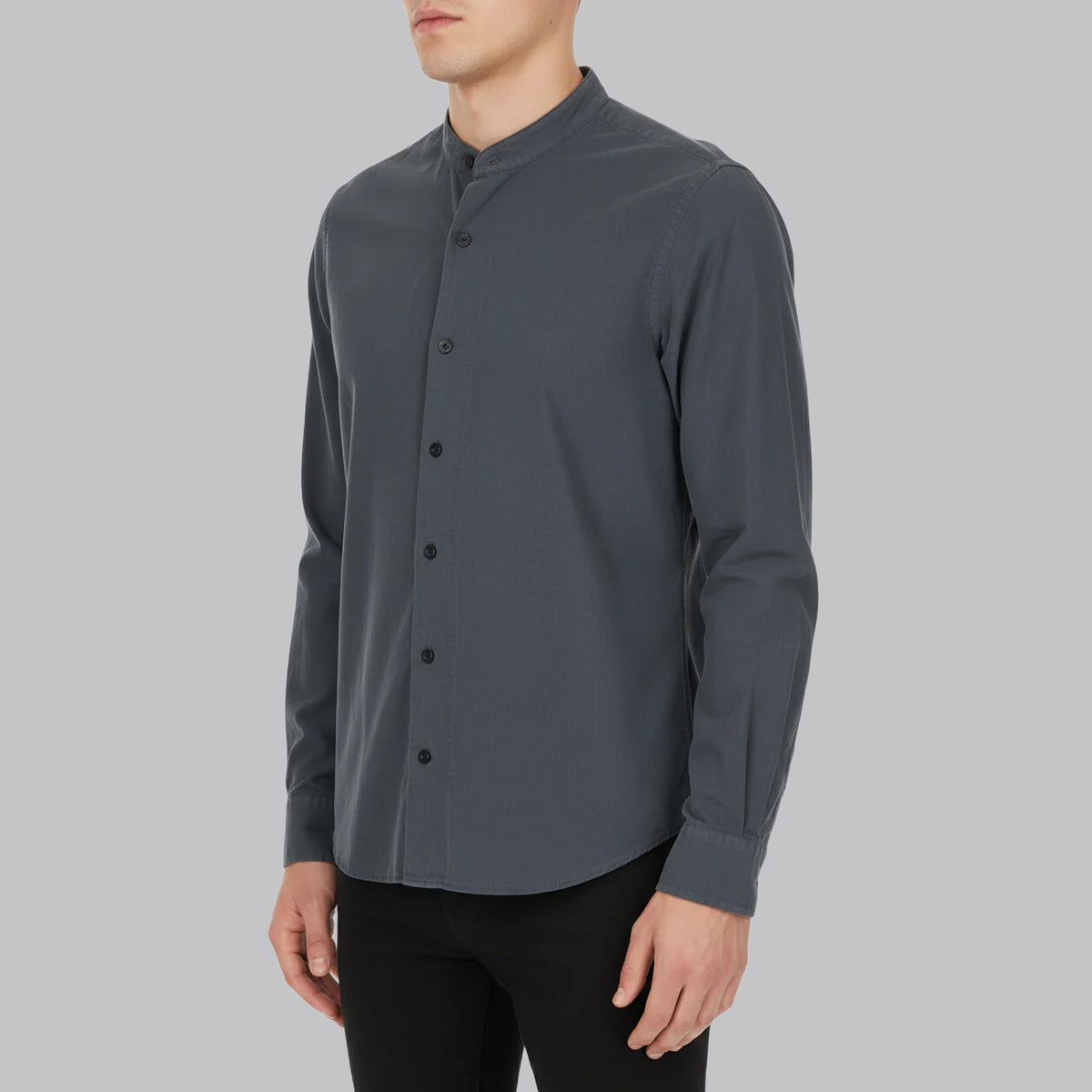 • Features a narrow stand‑collar with a subtle slit beneath the button placket. Straight cut, true‑to‑size fit.