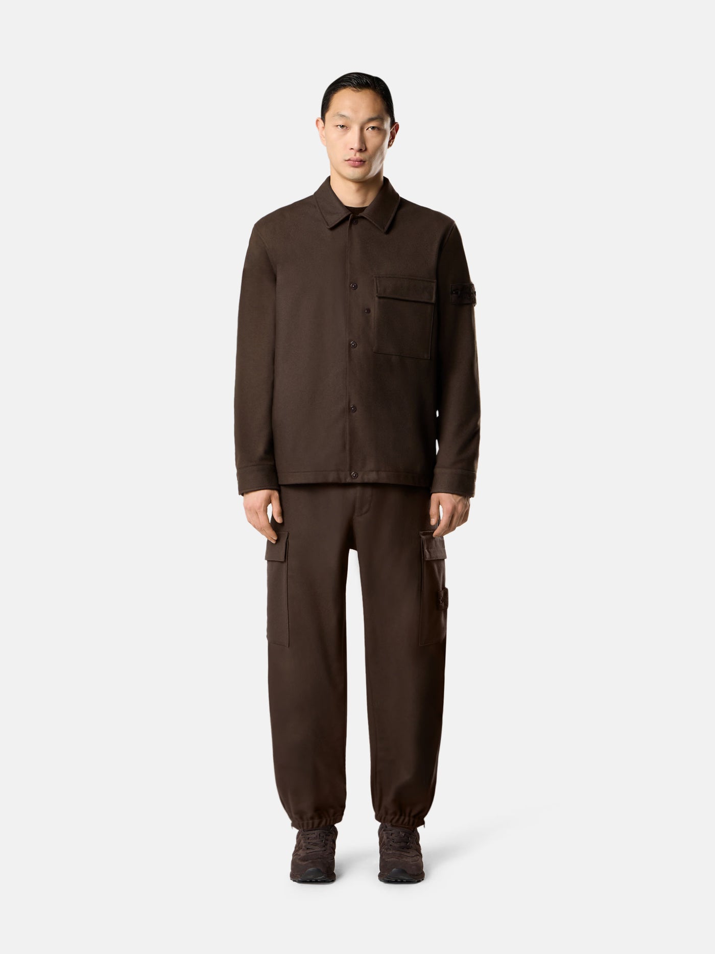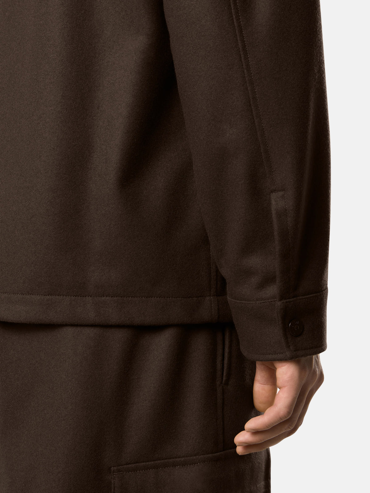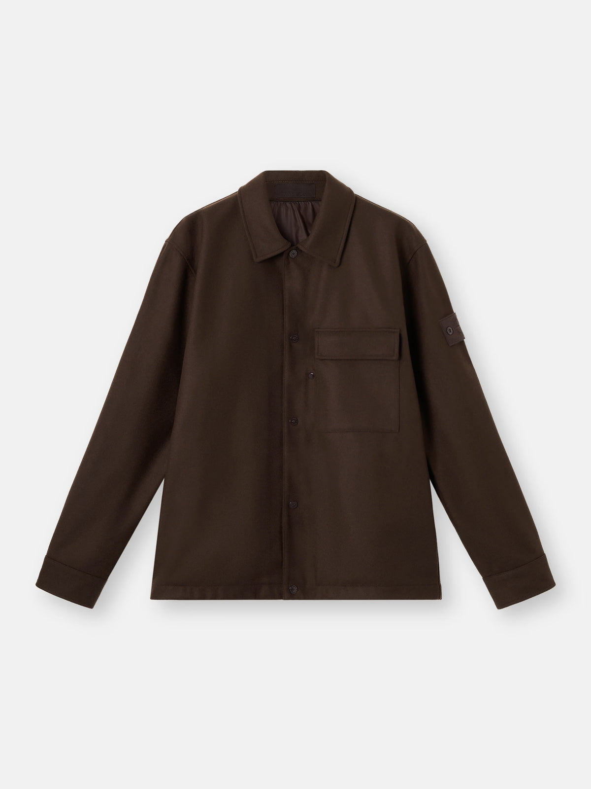 Overshirt in a carded wool nylon flannel with a chest pocket, internal pocket, snap cuffs, snap fastening, and nylon lining.