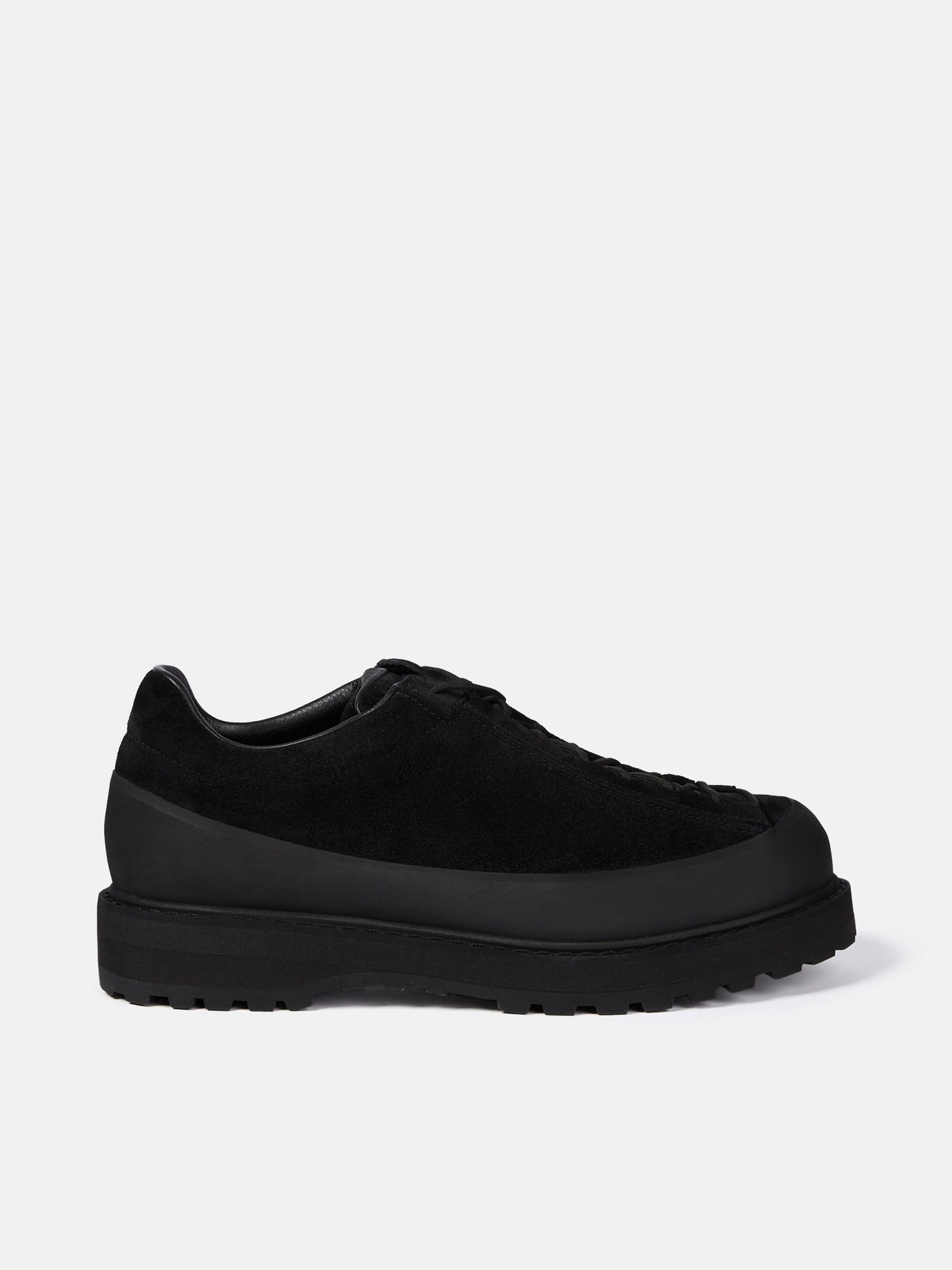 Trainer in suede leather featuring nylon cord lacing, a padded tongue with Compass logo patch, contour rubber rand, and lug sole.