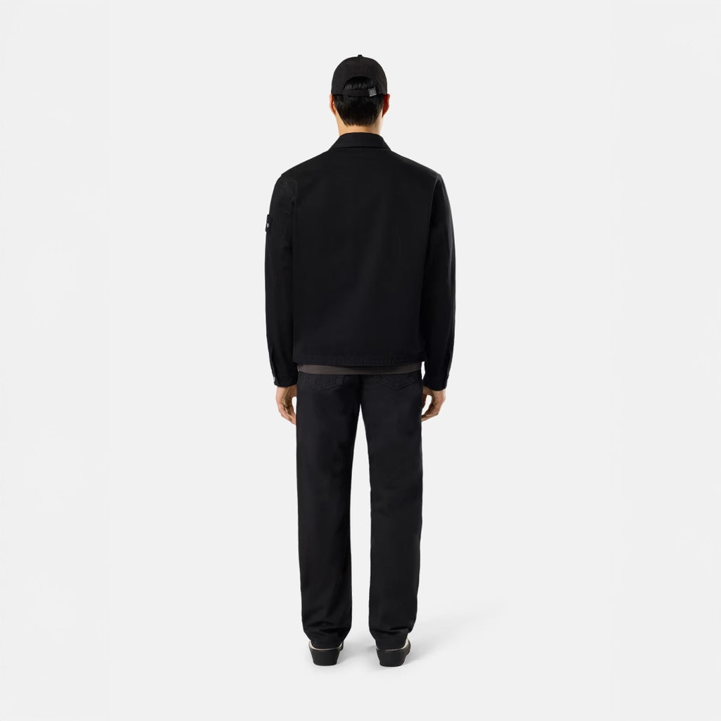 - Curved hand pockets with coin pocket on right side and small star embroidery under left pocket. - Stone Island Denim Research badge with metal buttons on back waistband. - Patch back pockets with reinforced lined bottom and horizontal stitch detail. - Concealed button fly with visible black top button. - Regular straight fit.